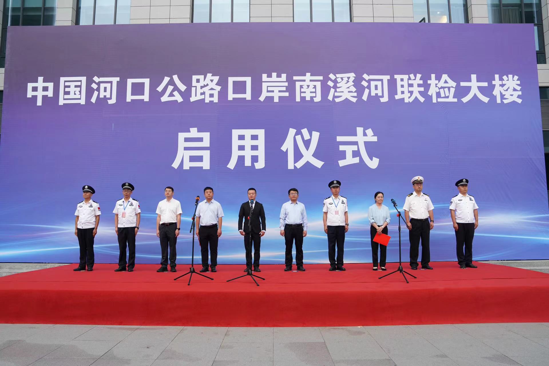 省商务厅副厅长、省口岸办主任马俊(主席台左五)宣布中国河口公路口岸南溪河新联检大楼正式启用(图片来源:云南省商务厅公众号)
